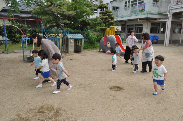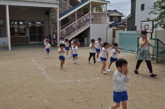 今年度初めての火災避難訓練を行いました。ふたば組・つぼみ組のお友だちも加わって、先生の後について煙を吸わないように園庭の隅まで逃げる練習をしました。初めての訓練に少しビックリしたお友だちもいましたが、上手に訓練出来ました。次は消防署から消防士さんと消防車が来てくれます。