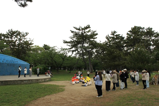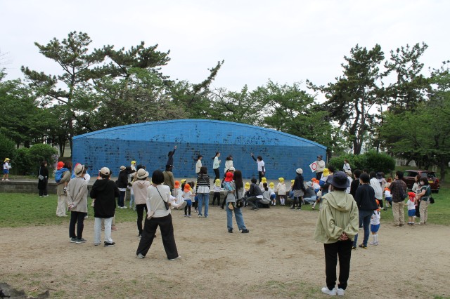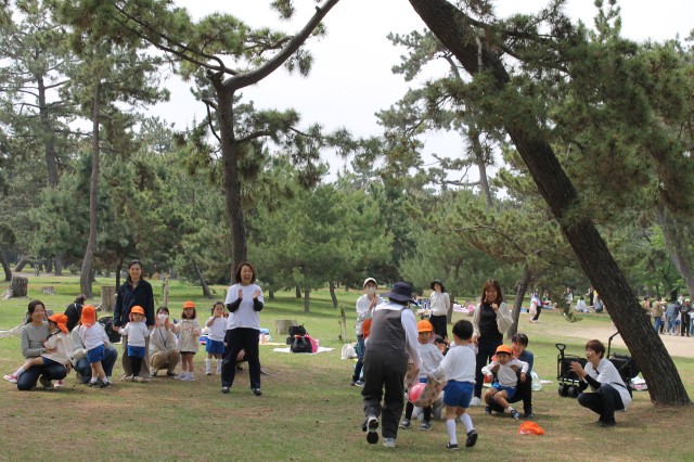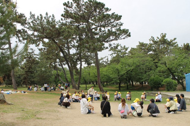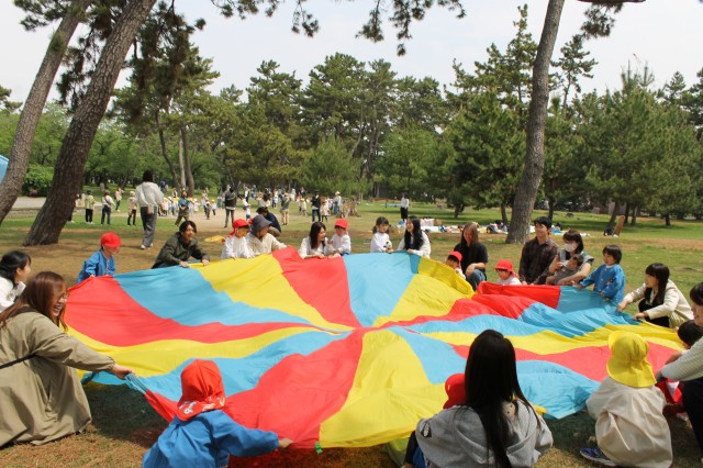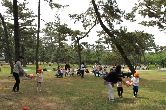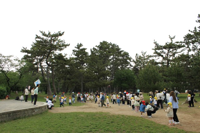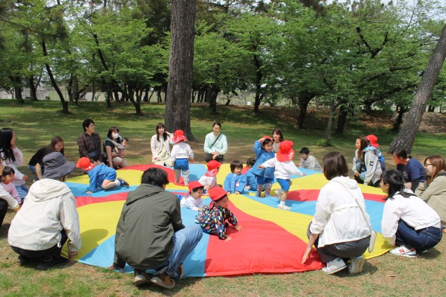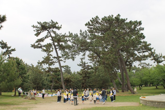 今日は親子でピクニックを楽しみました。お外で皆で集まって神さまに礼拝をおささげして、そのあとはクイズタイム!幼稚園にまつわるクイズに○✖で答えるゲームと、先生たちが大縄跳びに10回挑戦できるかなクイズ。(見事20回も飛べました!)クラスごとに写真撮影をしたあとは、広い芝生を使ってしっぽ取りをしたり、みんなで丸くなって自己紹介、ボール運びやバルーンで遊び、お腹が空くのも早くていつもより早めのお弁当時間。お家の人と一緒の時間はどの子にとっても笑顔がいっぱいでした。体調を崩してお休みのお友だちがたくさんいたのが、寂しく残念でしたが、気持ちのいい公園でたくさん遊べて楽しい時間になりました。日頃お顔を合わすことのない方や、お引越ししてきた新しいお友だちの親子さんとも出会えてよかったですね。