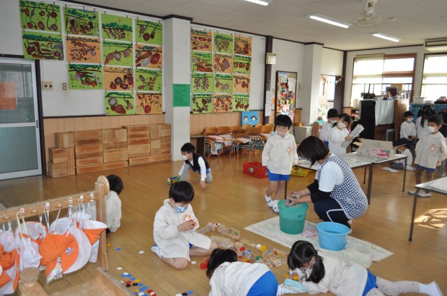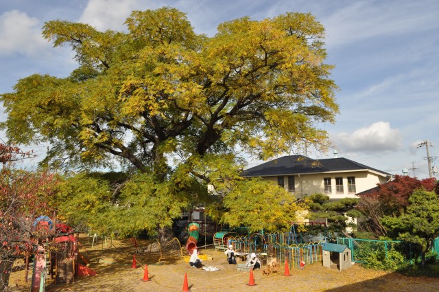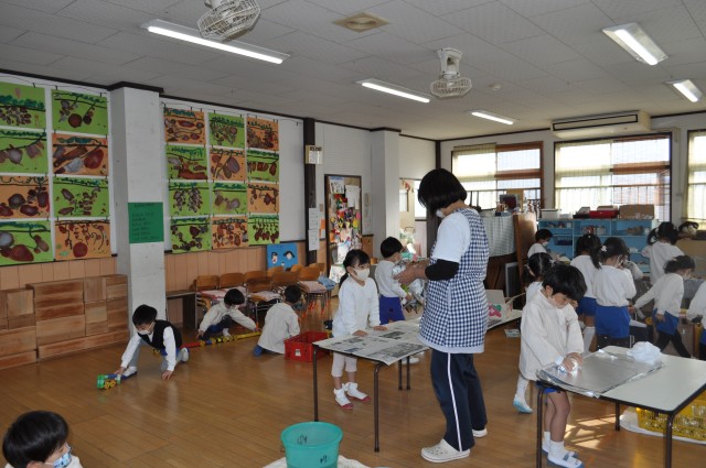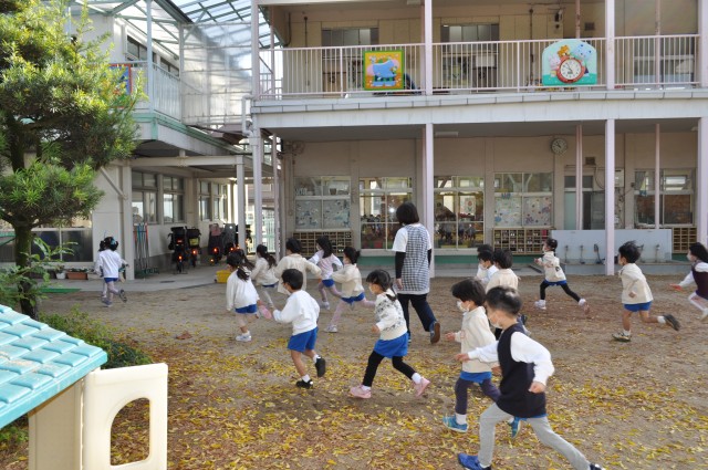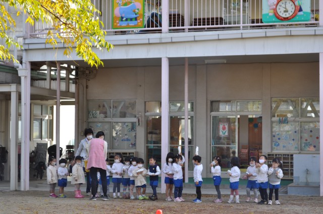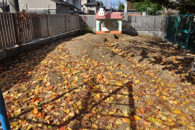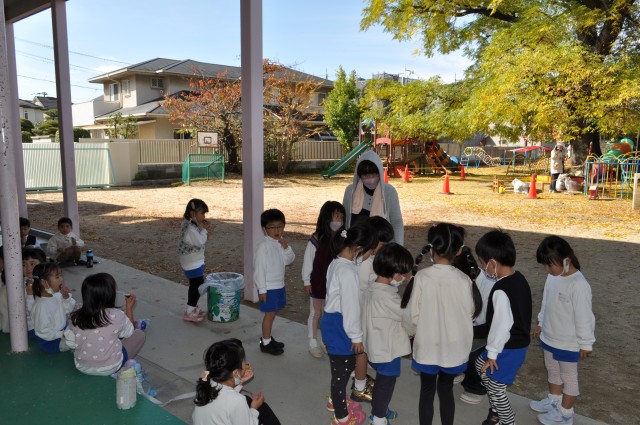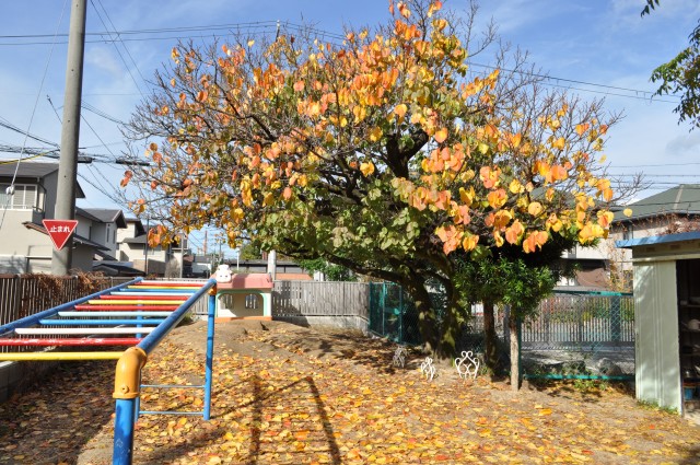 秋が深まり、幼稚園のお庭には、紅葉のじゅうたんが広がっています。登園してきた子どもたちが、「きれい~」としばらく見つめるほど美しい景色です。葉っぱを集めて、ふわっと投げてみたり、川に流してみたり、いっぱい拾っておみやげにしたり、色んな遊びが広がる楽しい季節です。