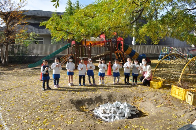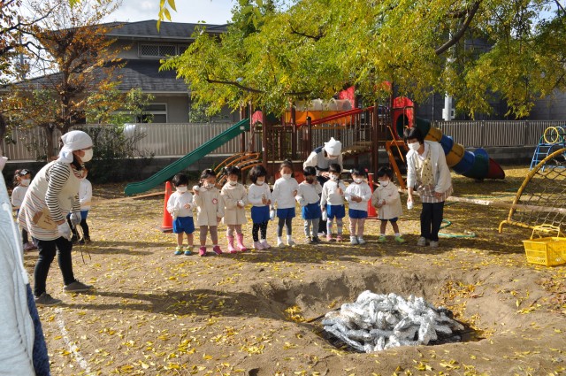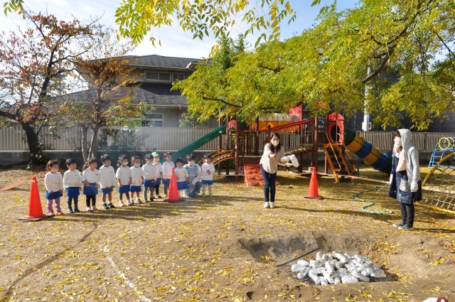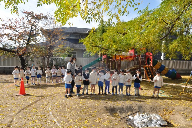 おいもに新聞紙とアルミホイルを巻いて、ぎゅっぎゅっと握り、焼いもの準備をそれぞれのクラスで頑張りました。おいもの準備ができたら、火の中に投げ入れます。投げた後、おいもはどうなるのかな?と気になって、しばらく見つめる子もいましたよ♡