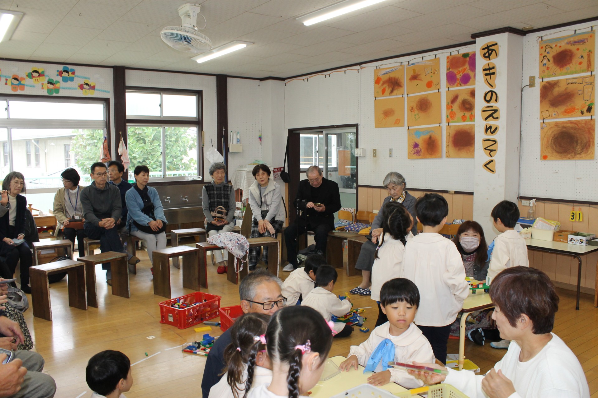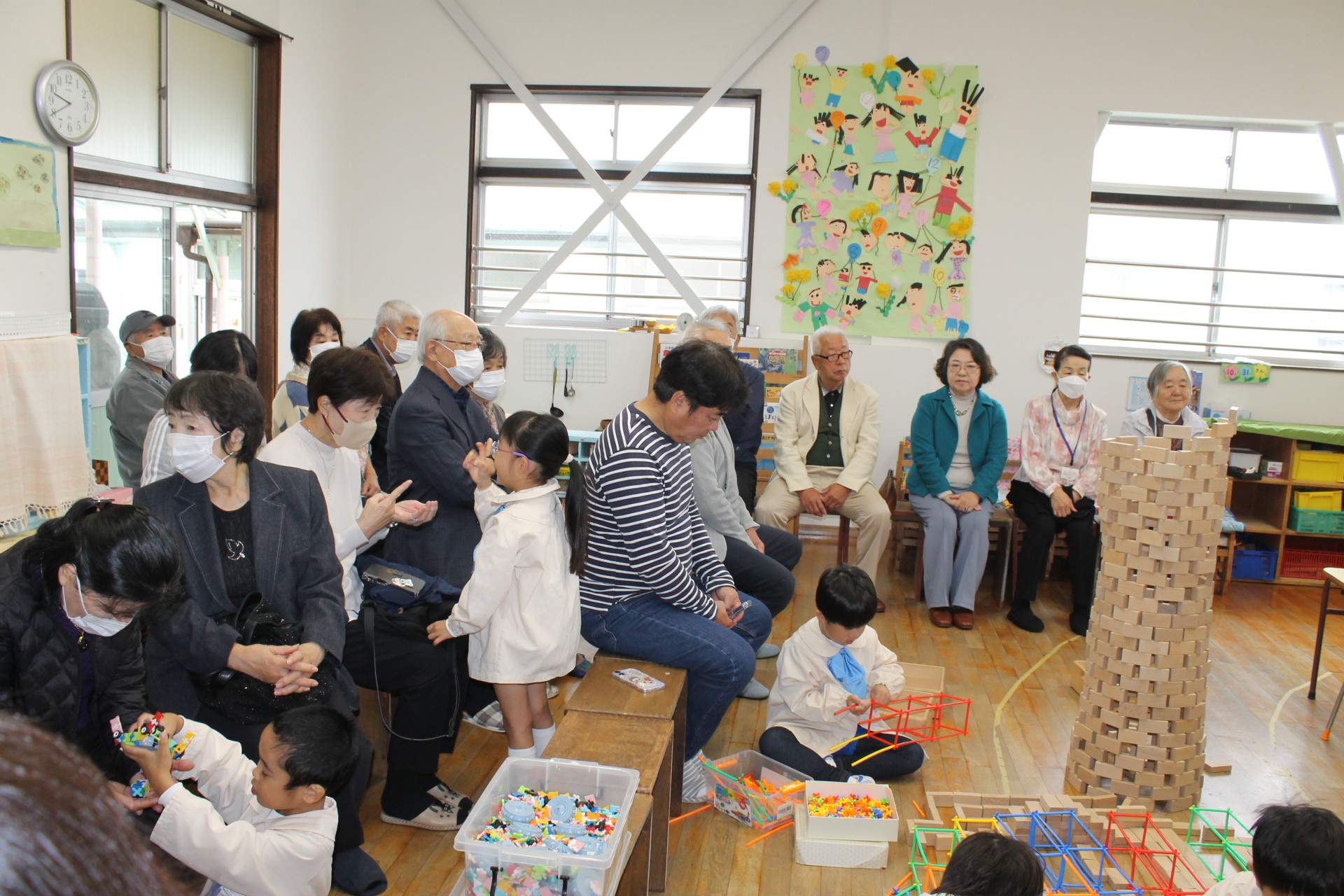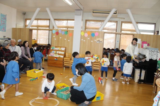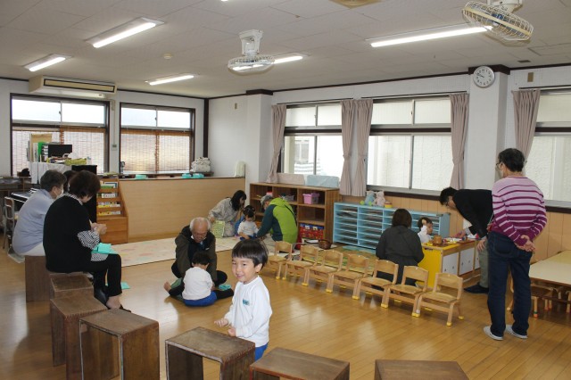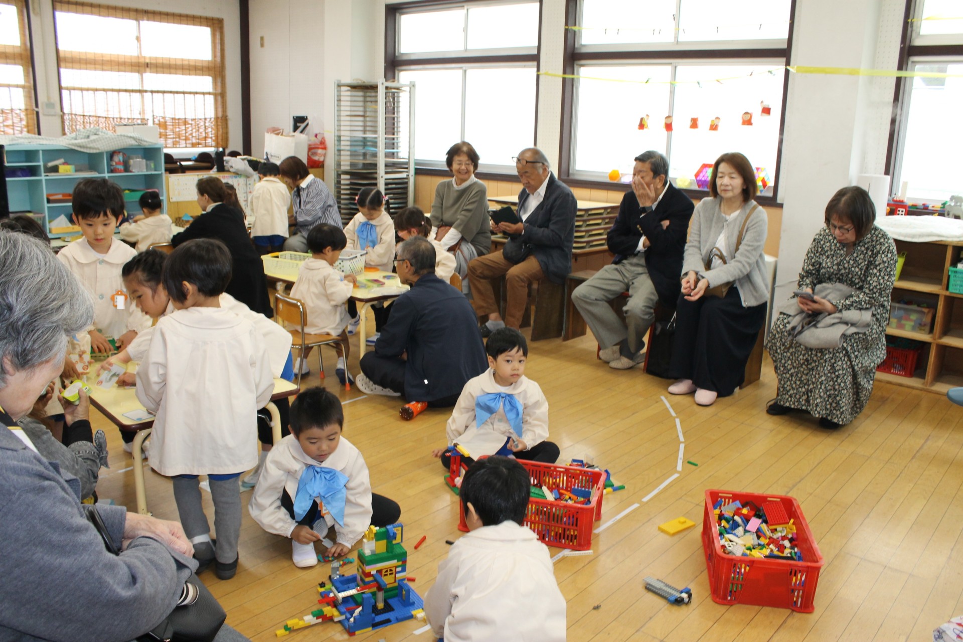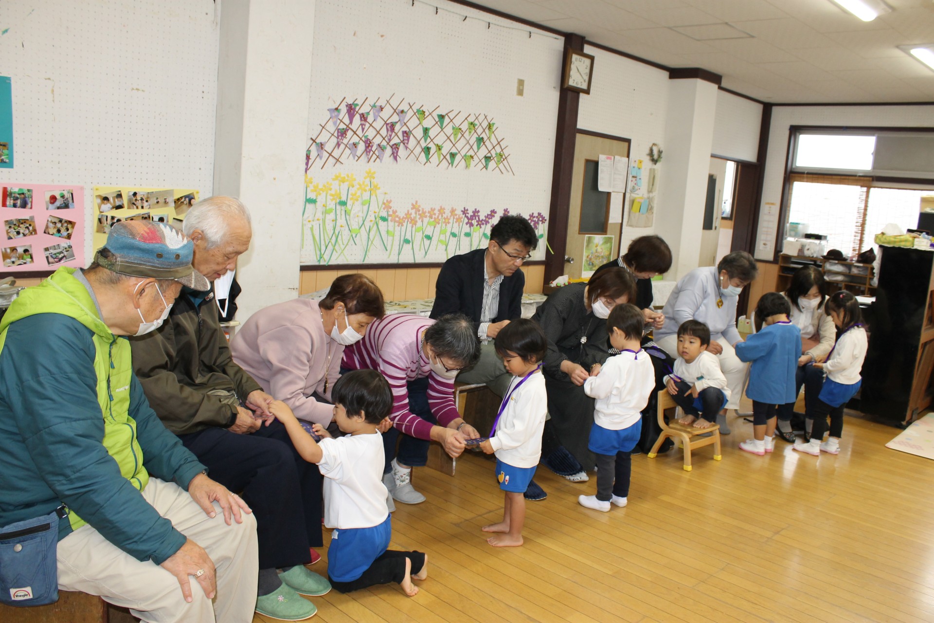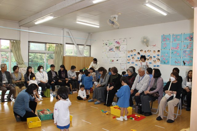 今日は祖父母の集いの日…。朝からあいにくの雨でしたが、普段幼稚園に来ることがあまりないおじいちゃん・おばあちゃんが来てくれて子どもたちは嬉しそうでした。各保育室で、朝の自由な遊びから礼拝の時間を一緒に過ごしていただいて、そのあとは各クラスそれぞれふれあい遊びや変身ゲーム、宝探しなど