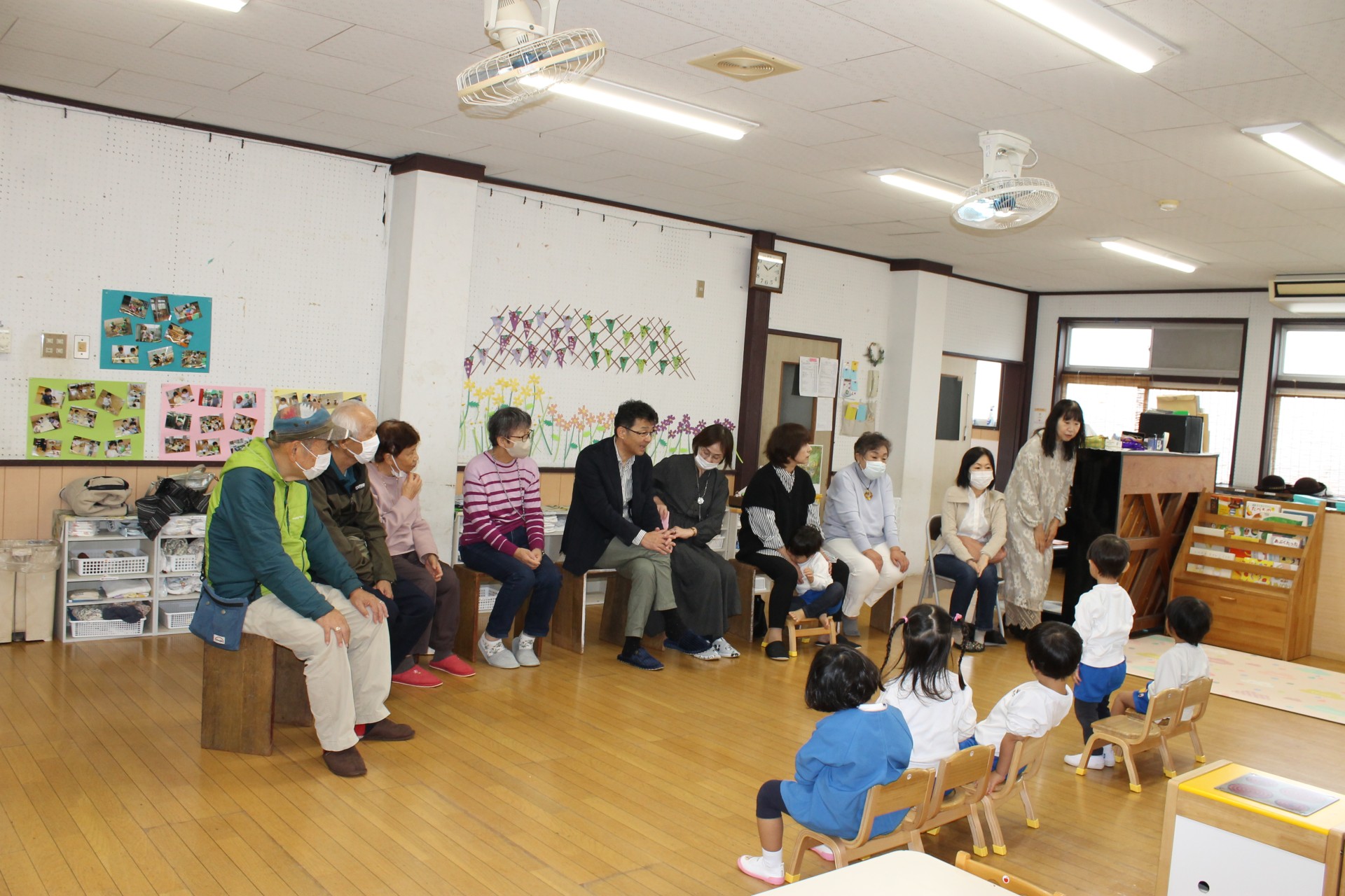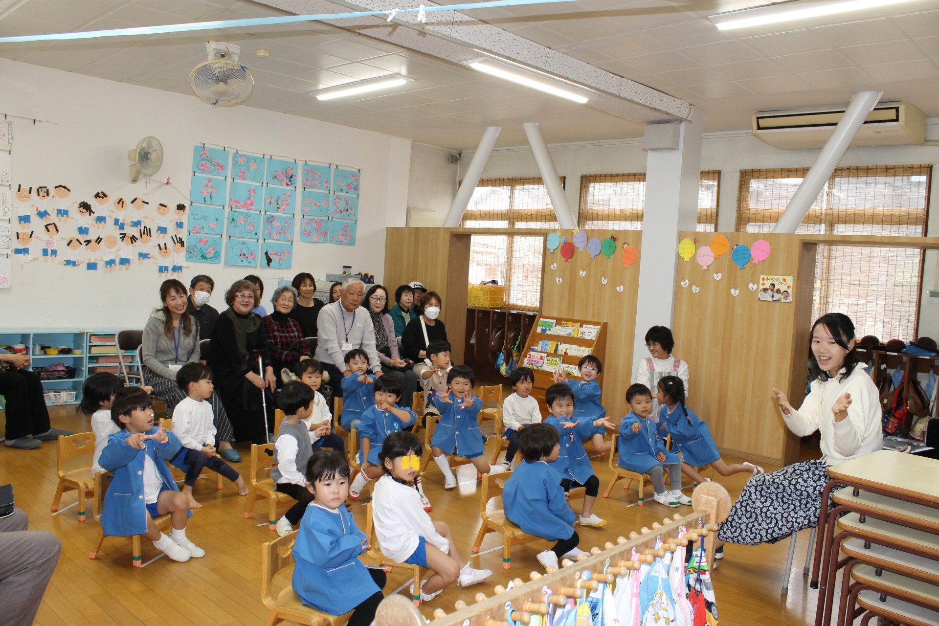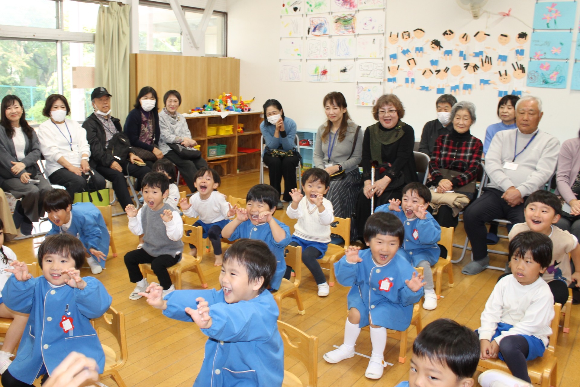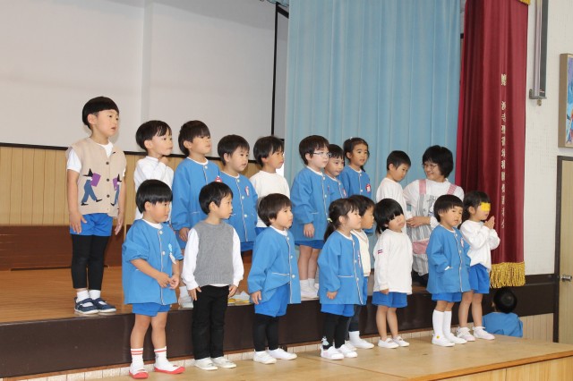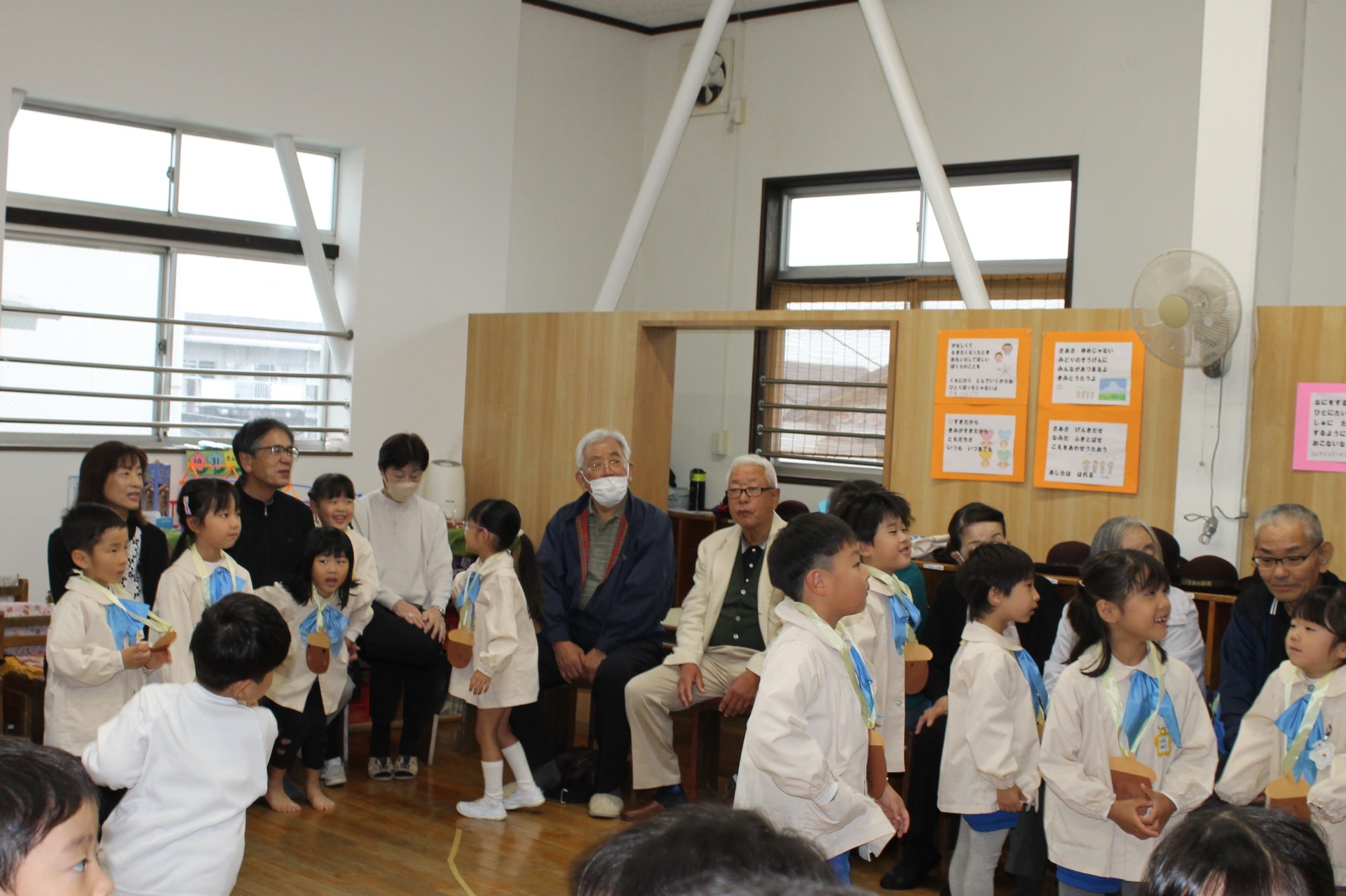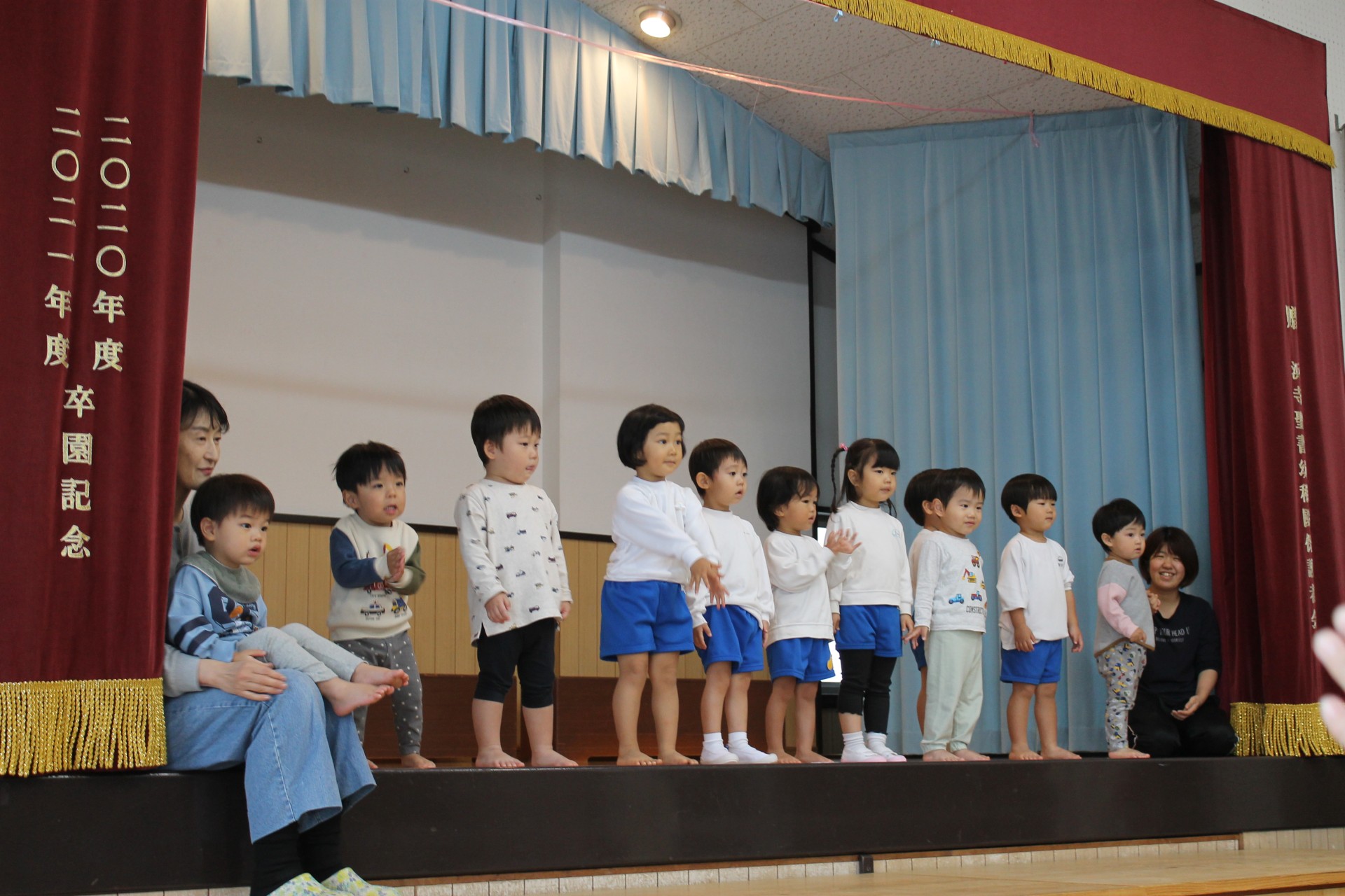 後半の時間はお遊戯室に移動して少し休憩していただき、今日来て下さった感謝を込めて舞台で子どもたちからの歌のプレゼント♪
