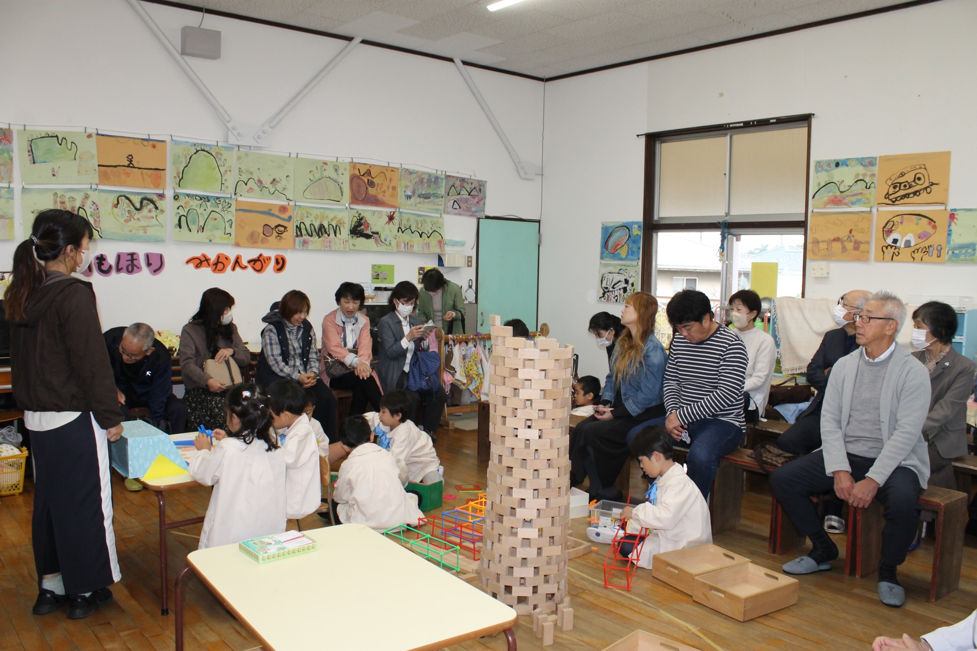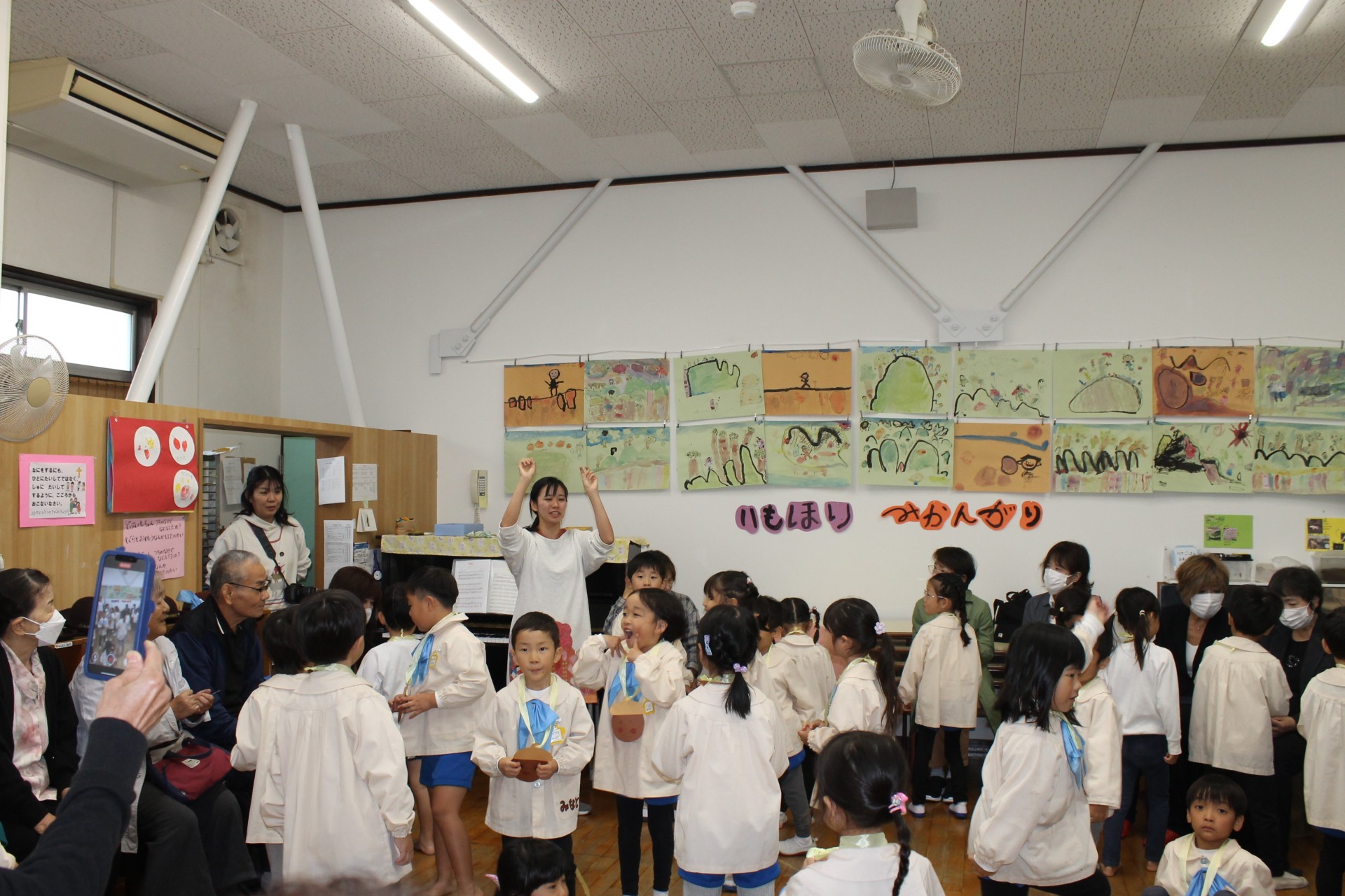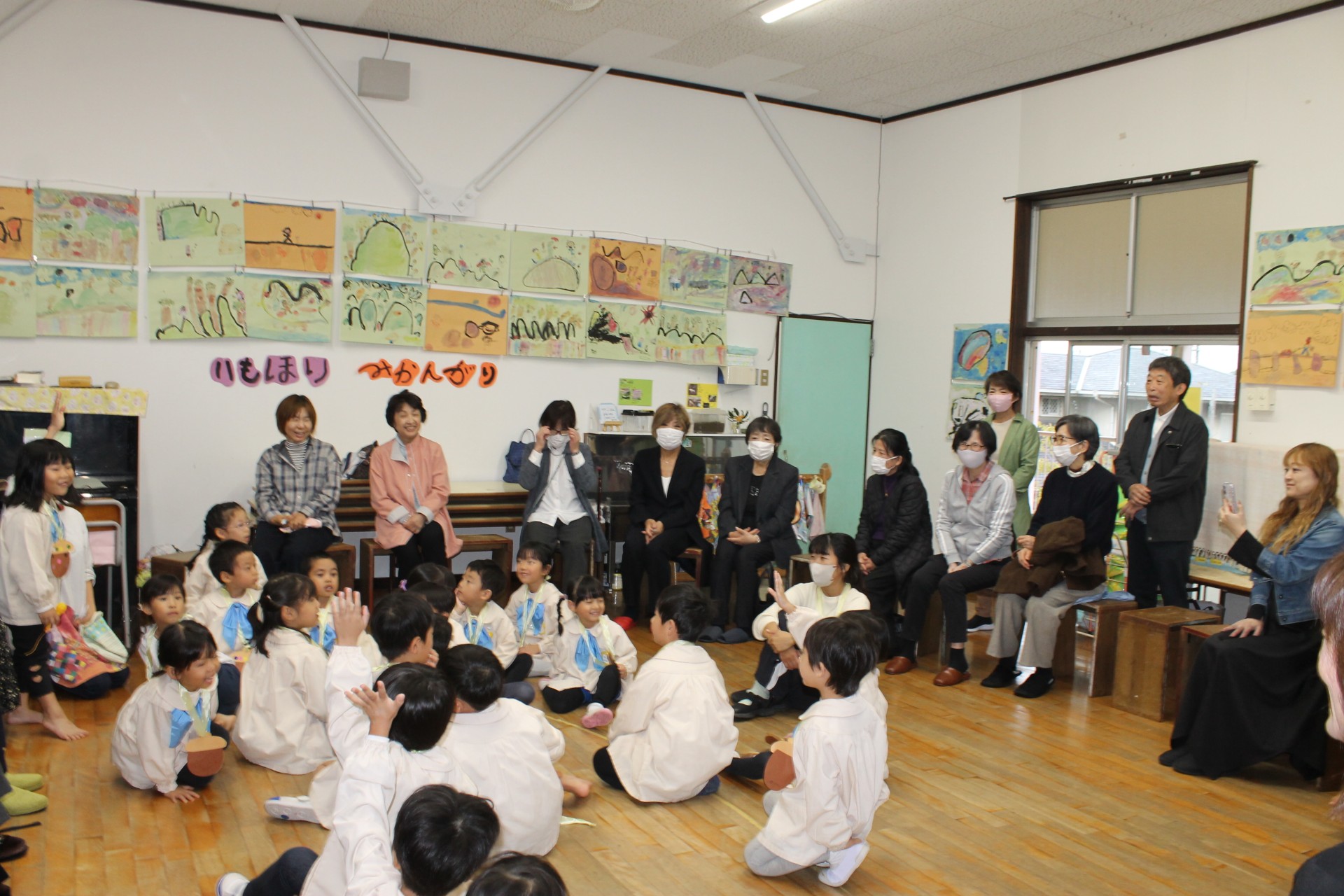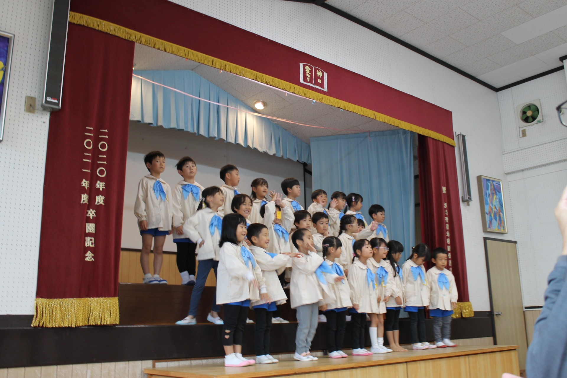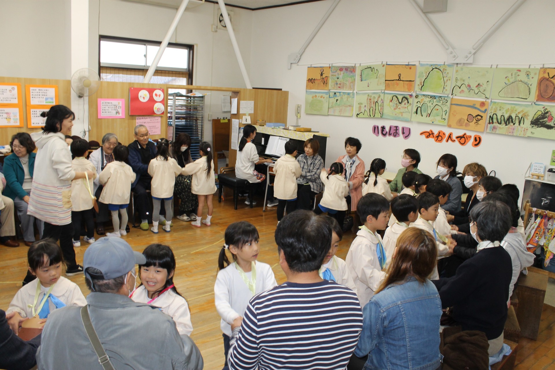 後半の時間はお遊戯室に移動して少し休憩していただき、今日来て下さった感謝を込めて舞台で子どもたちからの歌のプレゼント♪