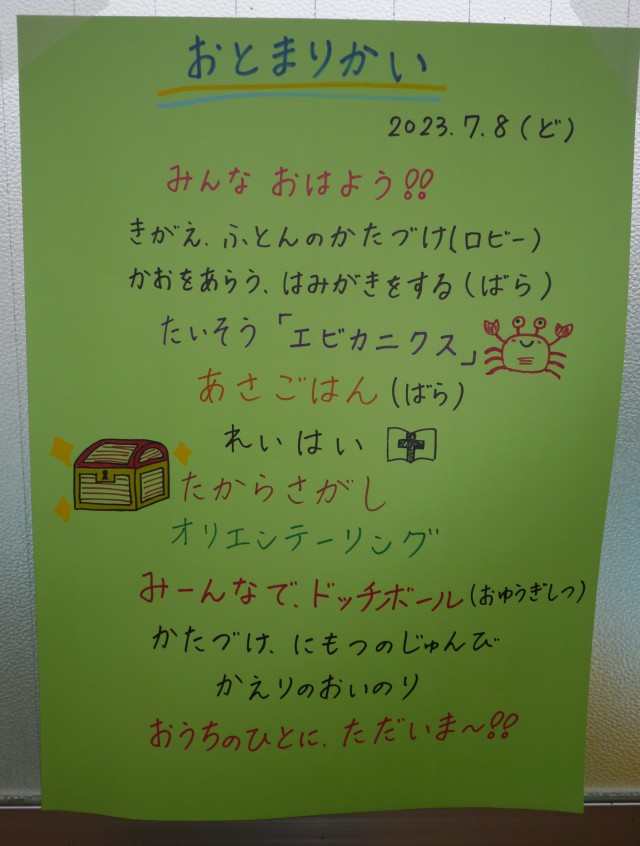 楽しい時間はあっという間。もう帰る時間です。「お泊まり会たのしかった人ー?」と聞くと、みんなが「はーい!!」と元気に答えてくれました。なかには、「今日も泊まりたいな~」とつぶやく子も♡楽しい思い出がたくさんできたね♪