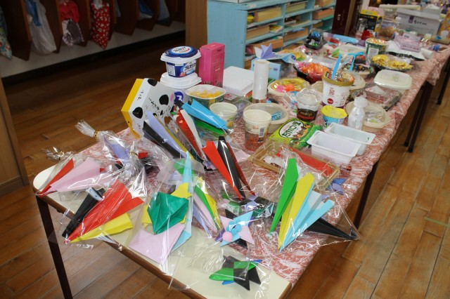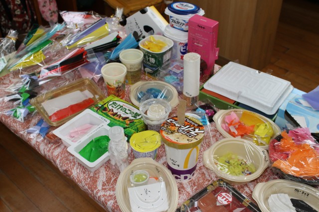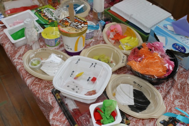 たくさんの廃材が集って、それをながめながら折紙や布、飾りやヒモを組み合わせて、