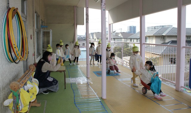 小さな子たちは外遊びででも、よく手押し車にのせてもらっているので、