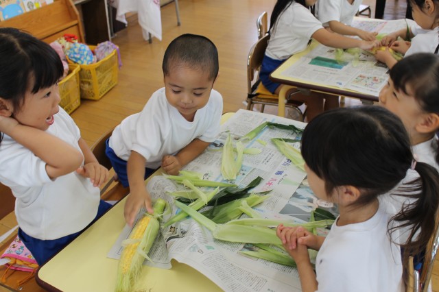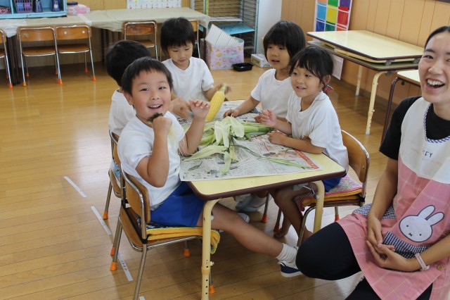 みんなでトウモロコシの皮むきをして、ひげを取って。ランチで美味しくいただきました。