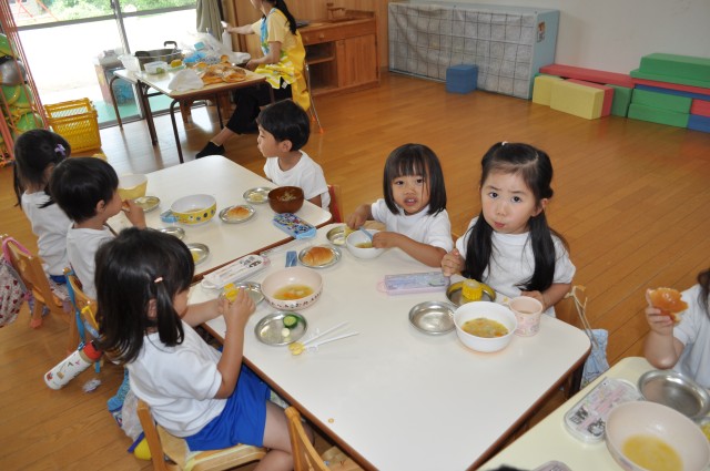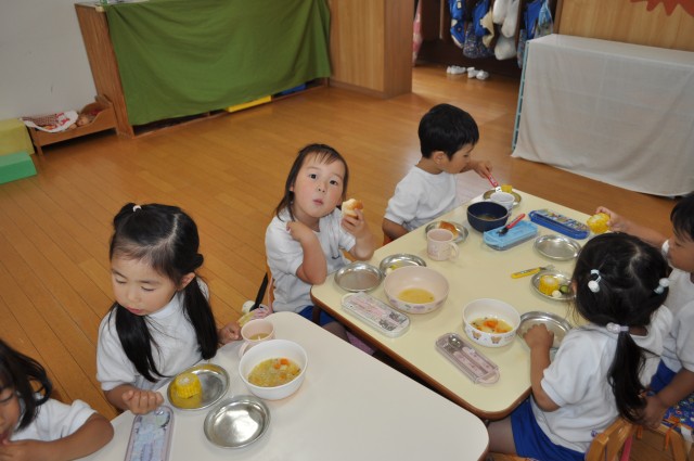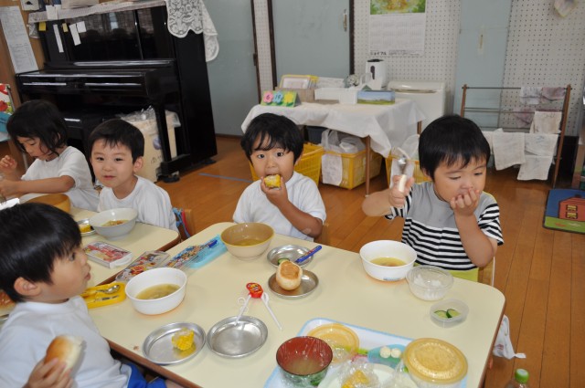 お庭の畑で育ったキュウリも年少さんのランチに加わって、今日は季節の野菜のオンパレードでした♡