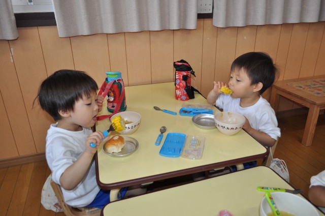 今日のトウモロコシはかぶりつきで「美味しい」と食べていました。