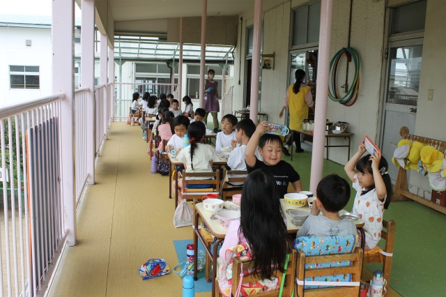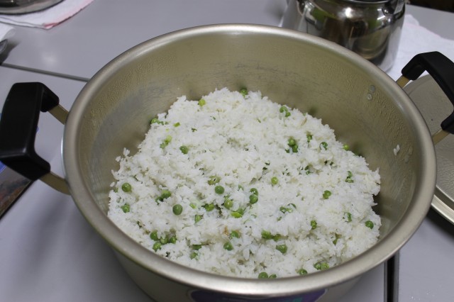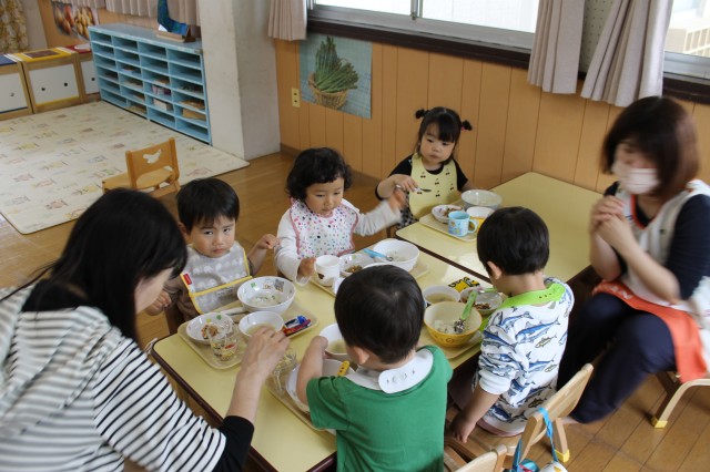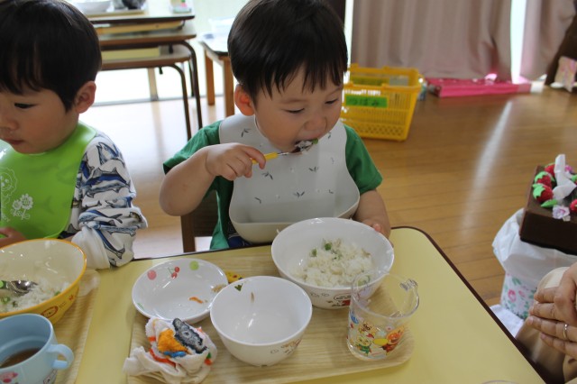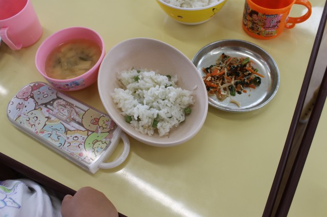 ランチの先生に「美味しくしてください」とお願いして、炊き上がるのを楽しみにランチの時間になりました。大きなお鍋に出来上がった豆ごはんを見て美味しそう~いっぱい食べる!と待ちきれない子もいれば、一つだけご飯の中に入れてもらって食べてみた子、ちょっと固くて…少しだけたべてみたなど、それぞれでしたが、今日むいたお豆が今日のランチに出てきたことは楽しい体験だったようです。
