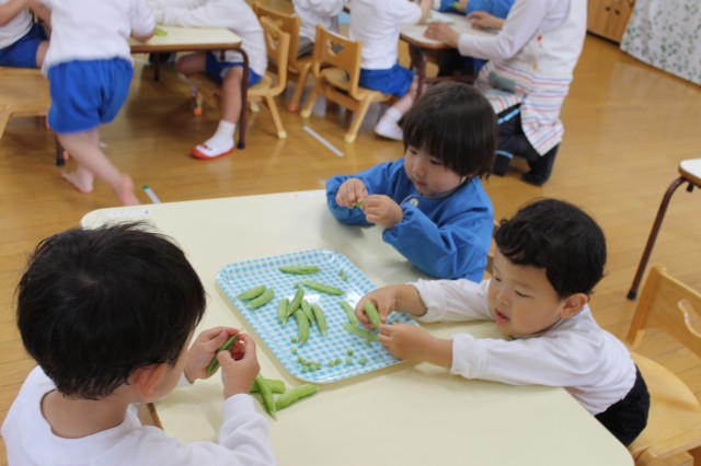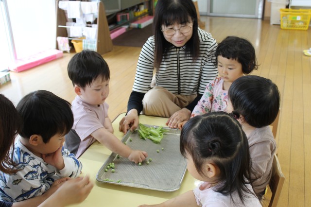 今日はみんなでお豆の皮むきをしました。実際に触ると皮が分厚くて固くて、どうやってむいたらいいのかな?と考えている子もいましたが、中に思っていた以上に、たくさん可愛いお豆たちが並んでつながっていたので、わあ!と大喜びしてどんどん剥いていきました。